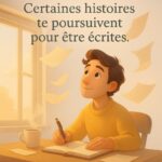 Illustration poétique d’un auteur entouré de pages qui flottent comme des souvenirs, symbole d’une histoire qui le poursuit.Hier, on évoquait ce qui t’a redonné envie d’écrire.